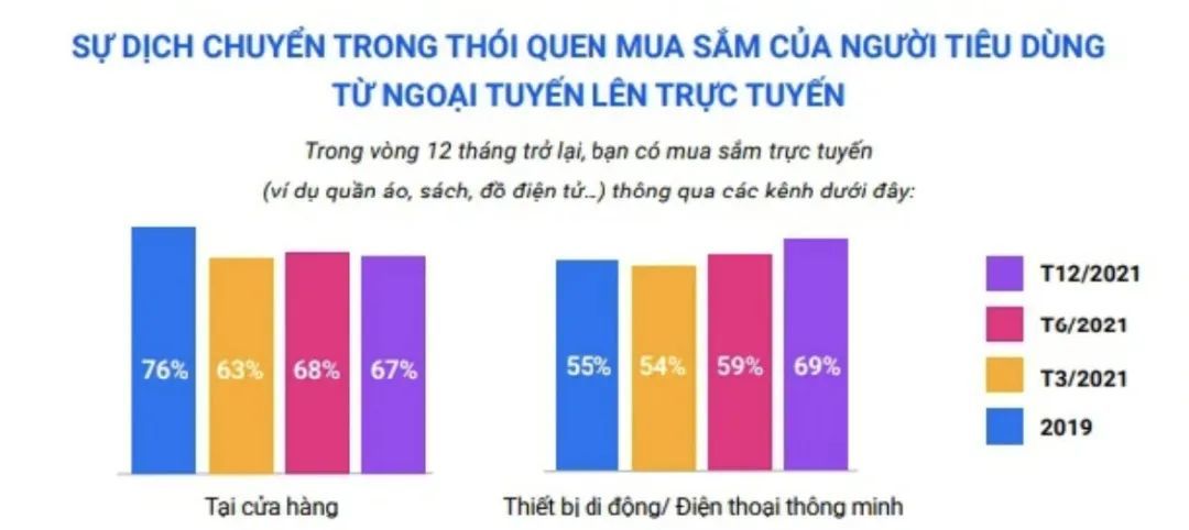 普华永道 2021 年 12 月的报告显示,在越南,通过实体店购物的人数比例将从 2019 年的 76% 下降到 2021 年底的 67%,而通过移动设备和智能手机购物的人数将从 55% 上升到 69%。