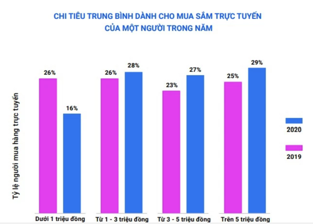 网上购物的消费也呈现出类似的趋势。虽然在线购物花费低于 100 万越南盾的消费者比例显着下降(从 2019 年的 26% 降至 2020 年的仅 16%).............
