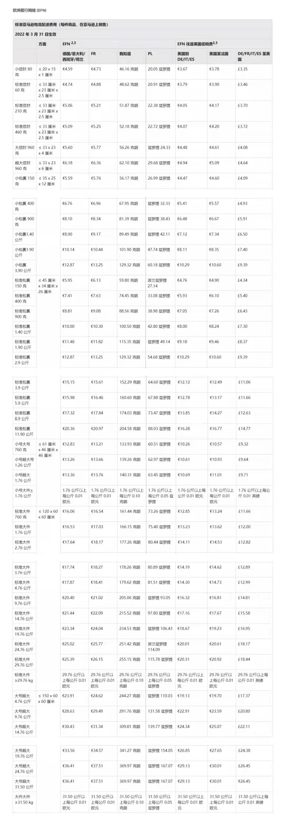 此外,值得注意的是,亚马逊还表示,自2022年3月31日起将更新亚马逊欧洲站的亚马逊物流配送费用(FBA) 。从2022年3月31日开始的一年促销期内,将为欧盟(德国、法国、意大利和西班牙)和英国之间的欧洲配送网络 (EFN) 费用提供20%的折扣。
