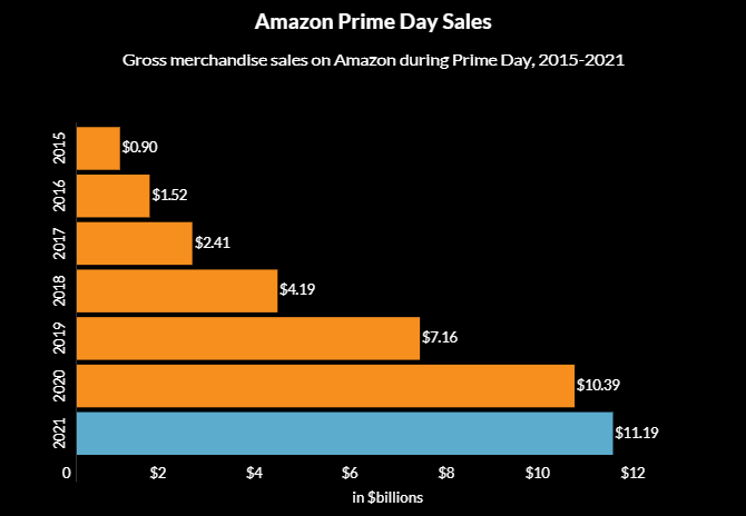先是亚马逊Prime Day显露疲态。根据Digital Commerce 360数据,在2021年6月21日至6月22日为期两天的Prime Day活动中,亚马逊全球销售额达111.9亿美元,仅同比增长7.6%。与此形成鲜明对比的是,2020年亚马逊Prime Day录入了104亿美元,同比增长了30%以上。