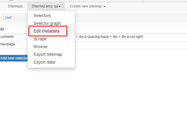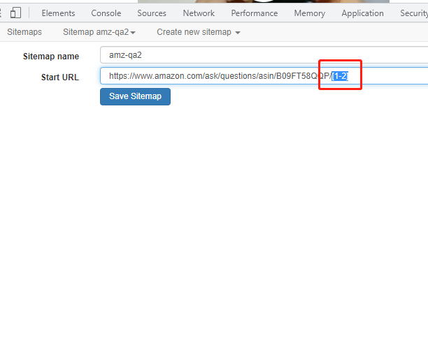 代码:{"_id":"amz-qa","startUrl":["https://www.amazon.com/ask/questions/asin/B09FT58QQP"],"selectors":[{"id":"contents","parentSelectors":["_root","nextpage"],"type":"SelectorElement","selector":".a-section > div.a-spacing-base > div > div.a-col-right","multiple":true,"delay":null},{"id":"question","parentSelectors":["contents"],"type":"SelectorText","selector":".a-spacing-small div.a-col-right","multiple":false,"delay":0,"regex":""},{"id":"answer","parentSelectors":["contents"],"type":"SelectorText","selector":".a-col-right > span:nth-of-type(1)","multiple":false,"delay":0,"regex":""},{"id":"buyer","parentSelectors":["contents"],"type":"SelectorText","selector":"span.a-profile-name","multiple":false,"delay":0,"regex":""},{"id":"date","parentSelectors":["contents"],"type":"SelectorText","selector":"span.a-color-tertiary","multiple":false,"delay":0,"regex":""},{"id":"nextpage","parentSelectors":["_root","nextpage"],"type":"SelectorLink","selector":".a-last a","multiple":true,"delay":0}]} 按图示,导入代码
