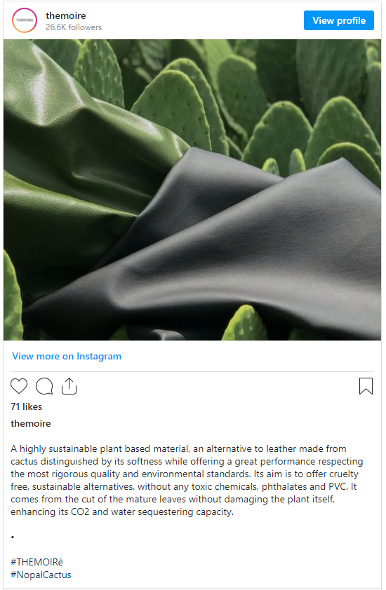 您可以分享材料和纹理的特写照片。或者您可以放大使您的产品独特和高质量的硬件和功能。例如,Themoire 分享了以下特写照片,重点介绍了他们用于包袋的高度可持续的植物基材料。